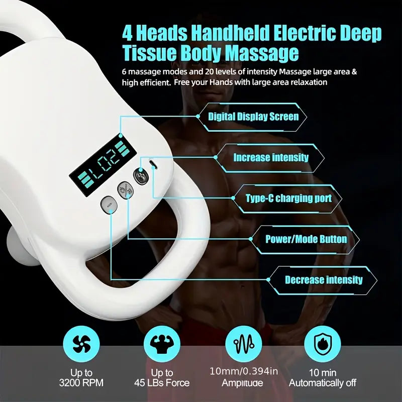 4 Interchangeable Massage Heads – Target different muscle groups with precision, including back, neck, shoulders, legs, arms, and feet.